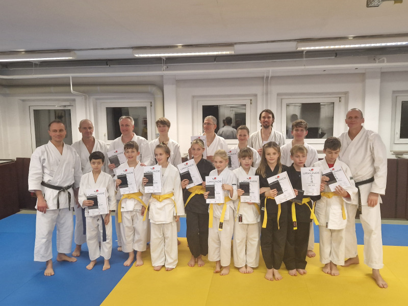 Mir persönlich hat der Ehrgeiz und Kampfgeist aller Teilnehmer:innen sehr gut gefallen, was auch unsere fast 30 zuschauenden Gäste mit viel Beifall bestätigen konnten. Als kleiner Höhepunkt konnte Maik in einem der vielen Abschlusskämpfe (jede:r gegen jede:n) für alle Braungurte gegen einen seiner jüngeren Gegner und Vereinspartner Kacper, einen wirklich top platzierten und völlig unerwarteten Ura-Mawashi-Geri Yodan sehr kontrolliert platzieren – dies wurde auch mit spontanen Applaus aller Zuschauenden honoriert.
